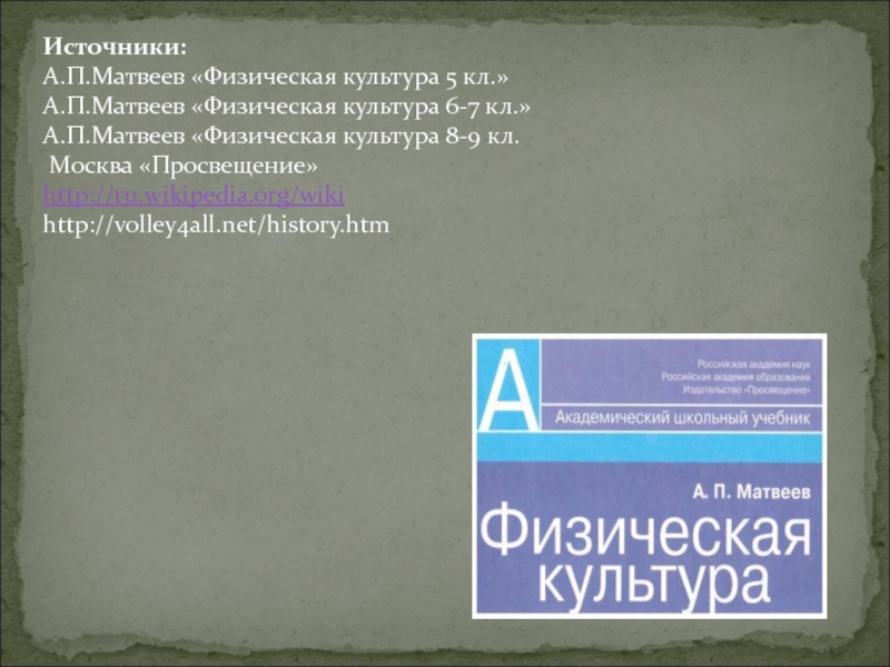 Источники: А.П.Матвеев «Физическая культура 5 кл.» А.П.Матвеев «Физическая культура 6-7 кл.» А.П.Матвеев «Физическая культура 8-9 кл. Москва «Просвещение» http://ru.wikipedia.org/wiki http://volley4all.net/history.htm