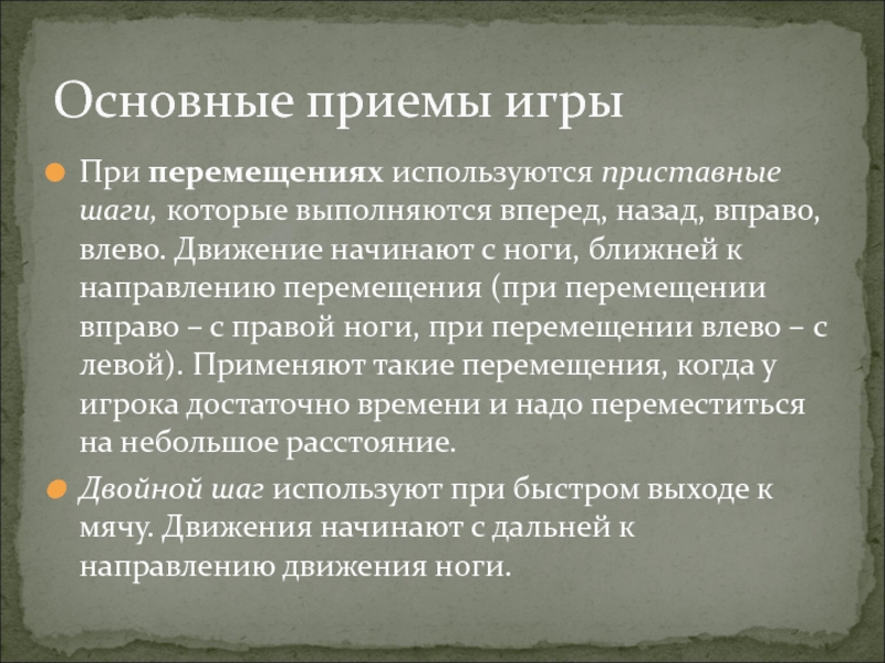 Слайд 10При перемещениях используются приставные шаги, которые выполняются вперед, назад, вправо, влево.