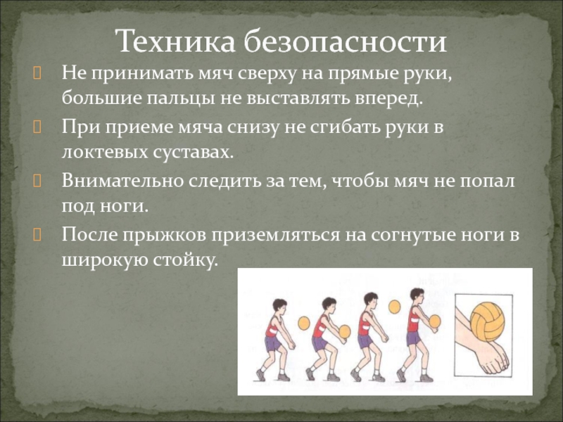 Не принимать мяч сверху на прямые руки, большие пальцы не выставлять вперед.При приеме мяча снизу не сгибать
