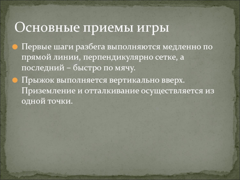 Слайд 20Первые шаги разбега выполняются медленно по прямой линии, перпендикулярно сетке, а