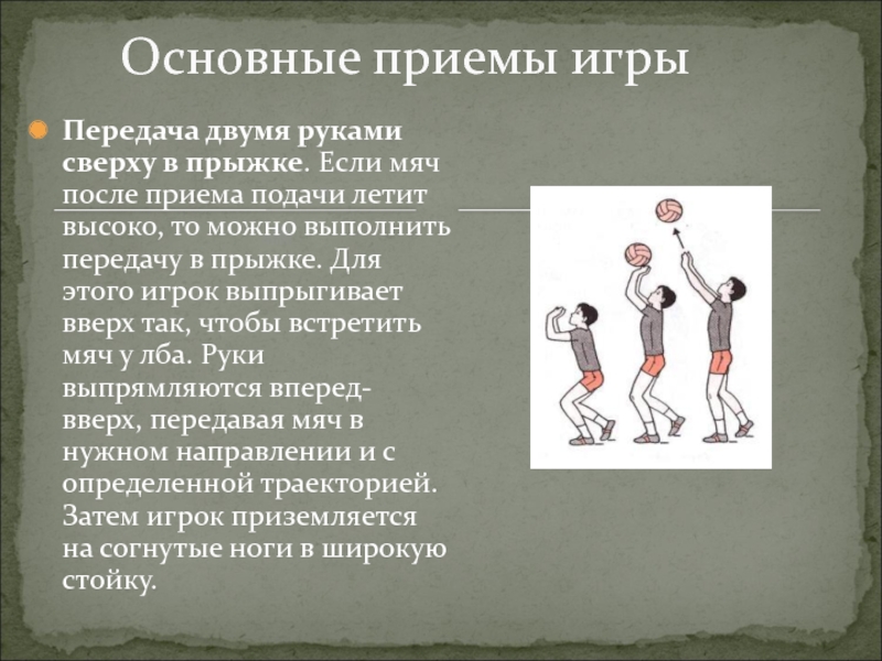Слайд 12Передача мяча сверху двумя руками является основным техническим приемом. Игрок должен