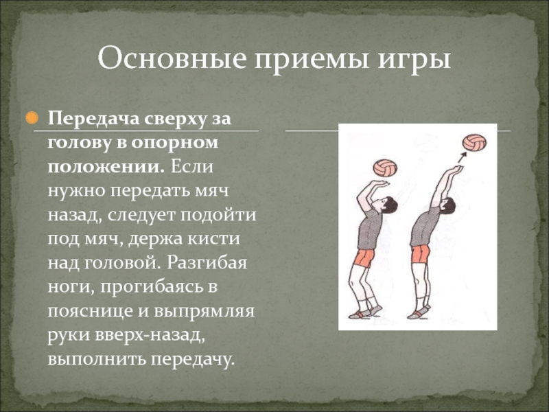 назад, следует подойти под мяч, держа кисти над головой. Разгибая ноги, прогибаясь в пояснице и выпрямляя руки вверх-назад, выполнить передачу.