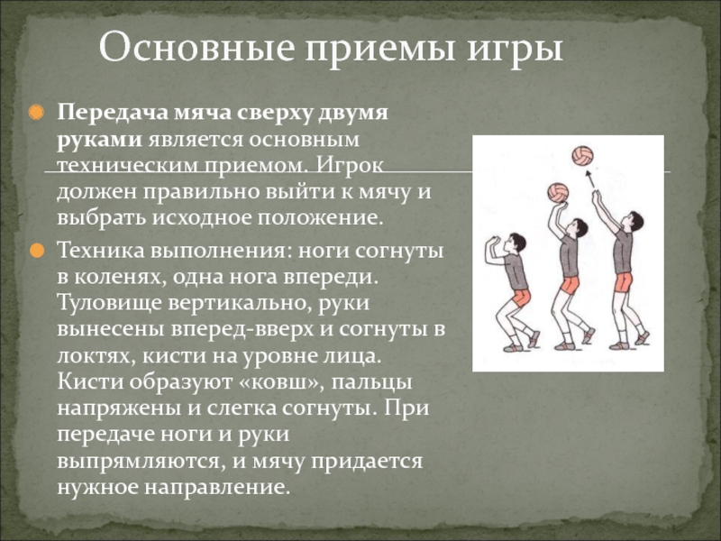Передача мяча сверху двумя руками является основным техническим приемом. Игрок должен правильно выйти к мячу и выбрать