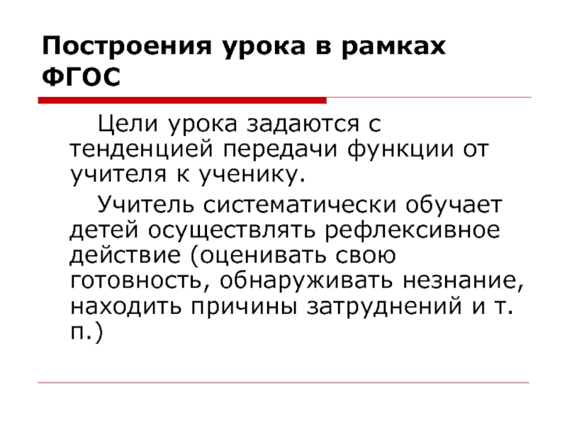 Учитель систематически обучает детей осуществлять рефлексивное действие (оценивать свою готовность, обнаруживать незнание, находить причины затруднений и т.п.)