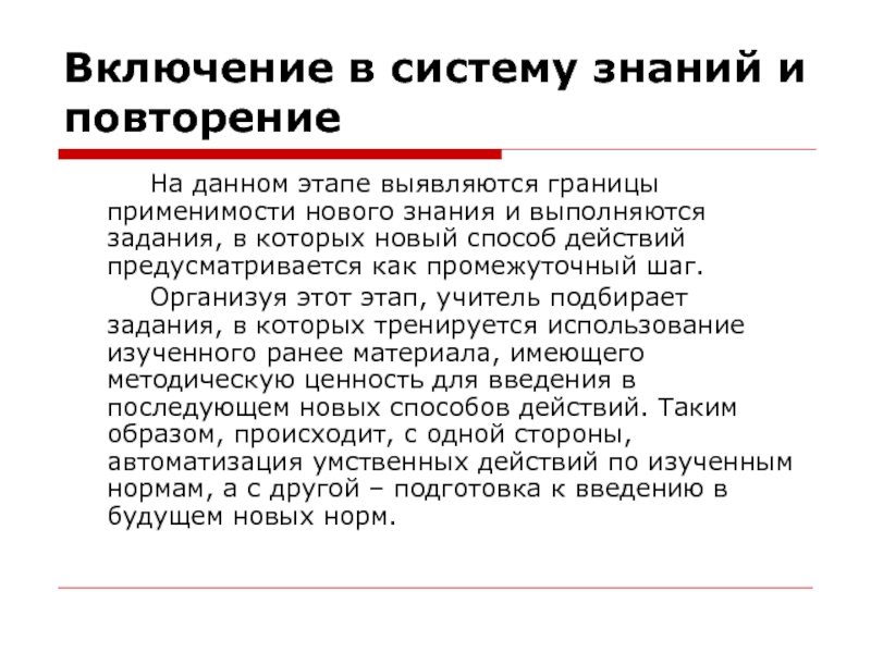 Организуя этот этап, учитель подбирает задания, в которых тренируется использование изученного ранее материала, имеющего методическую ценность для введения в последующем новых способов действий. Таким образом, происходит, с одной стороны, автоматизация умственных действий по изученным нормам, а с другой – подготовка к введению в будущем новых норм.