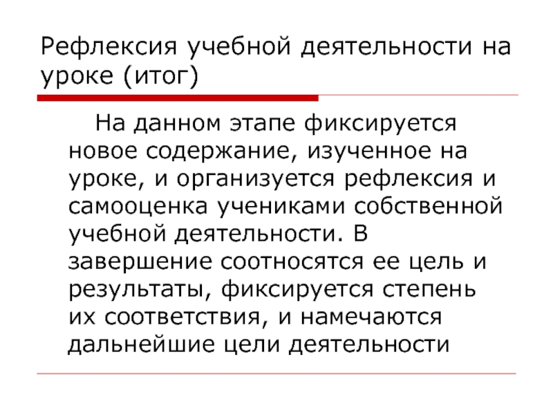 изученное на уроке, и организуется рефлексия и самооценка учениками собственной учебной деятельности. В завершение соотносятся ее цель и результаты, фиксируется степень их соответствия, и намечаются дальнейшие цели деятельности