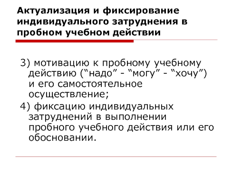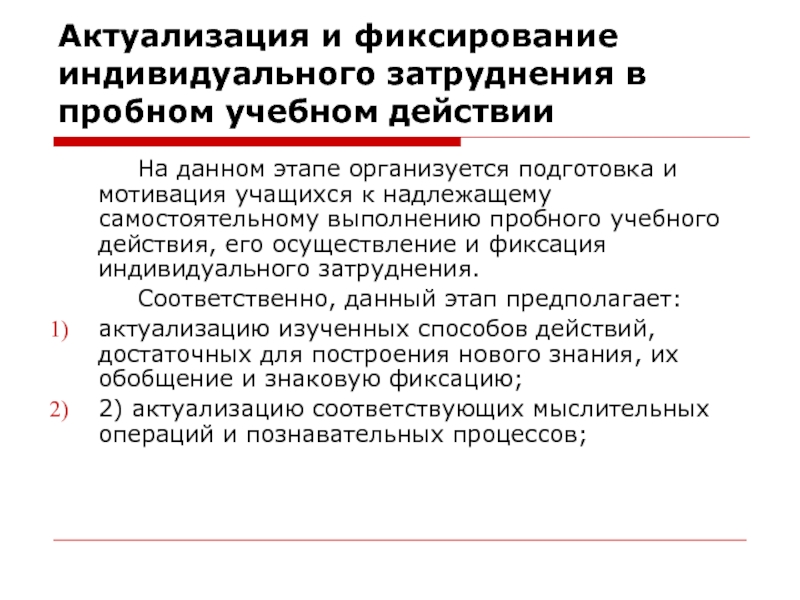 Слайд 30Актуализация и фиксирование индивидуального затруднения в пробном учебном действии