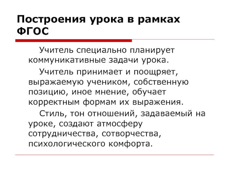 Стиль, тон отношений, задаваемый на уроке, создают атмосферу сотрудничества, сотворчества, психологического комфорта.