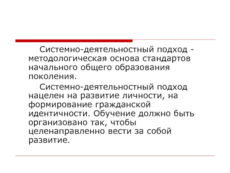 подход нацелен на развитие личности, на формирование гражданской идентичности. Обучение должно быть организовано так, чтобы целенаправленно вести за собой развитие.