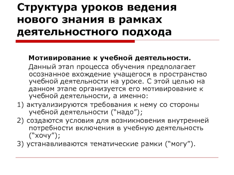 Слайд 29Структура уроков ведения нового знания в рамках деятельностного подхода