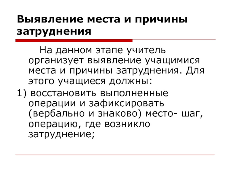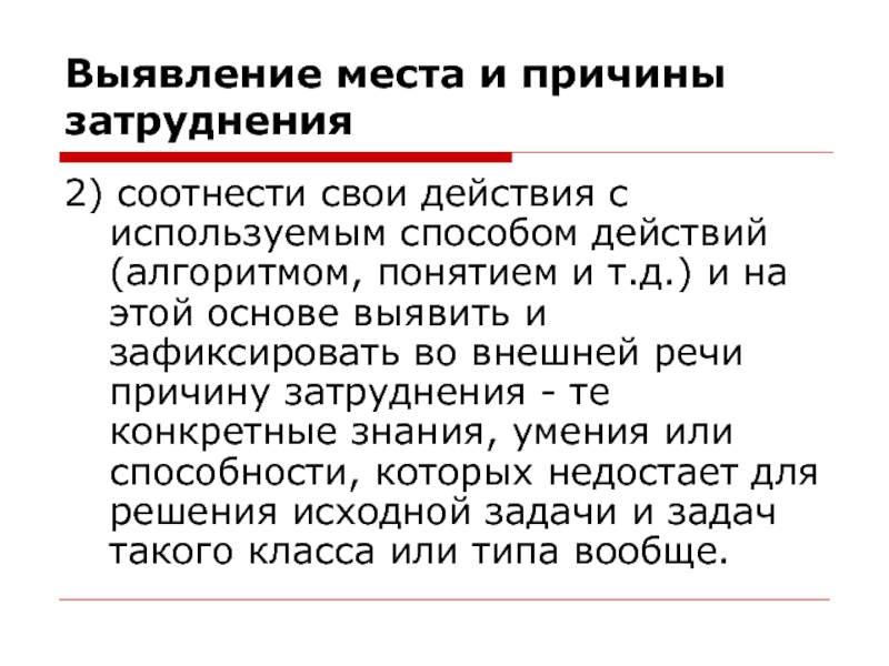 действий (алгоритмом, понятием и т.д.) и на этой основе выявить и зафиксировать во внешней речи причину затруднения - те конкретные знания, умения или способности, которых недостает для решения исходной задачи и задач такого класса или типа вообще.