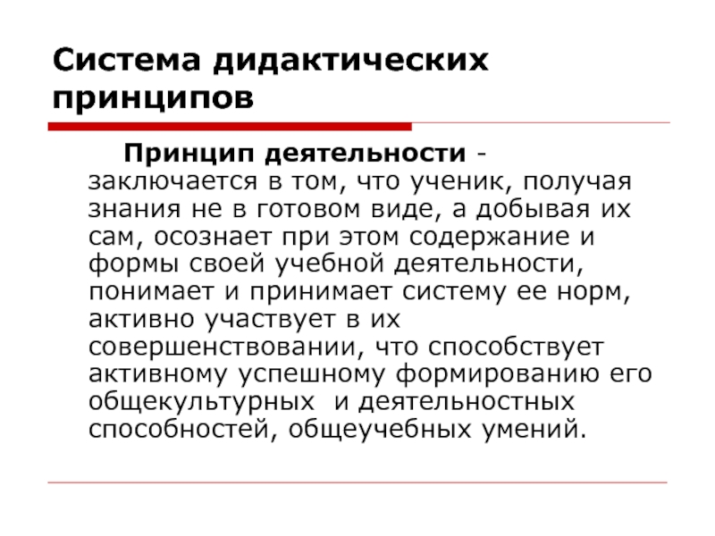 знания не в готовом виде, а добывая их сам, осознает при этом содержание и формы своей учебной деятельности, понимает и принимает систему ее норм, активно участвует в их совершенствовании, что способствует активному успешному формированию его общекультурных и деятельностных способностей, общеучебных умений.