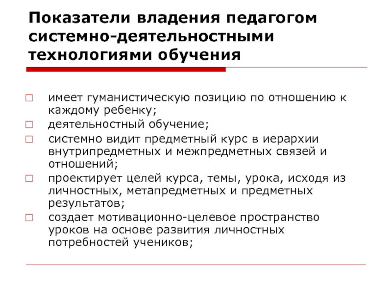Слайд 42Показатели владения педагогом системно-деятельностными технологиями обучения