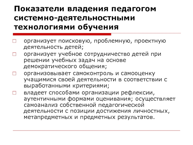 Слайд 41Показатели владения педагогом системно-деятельностными технологиями обучения