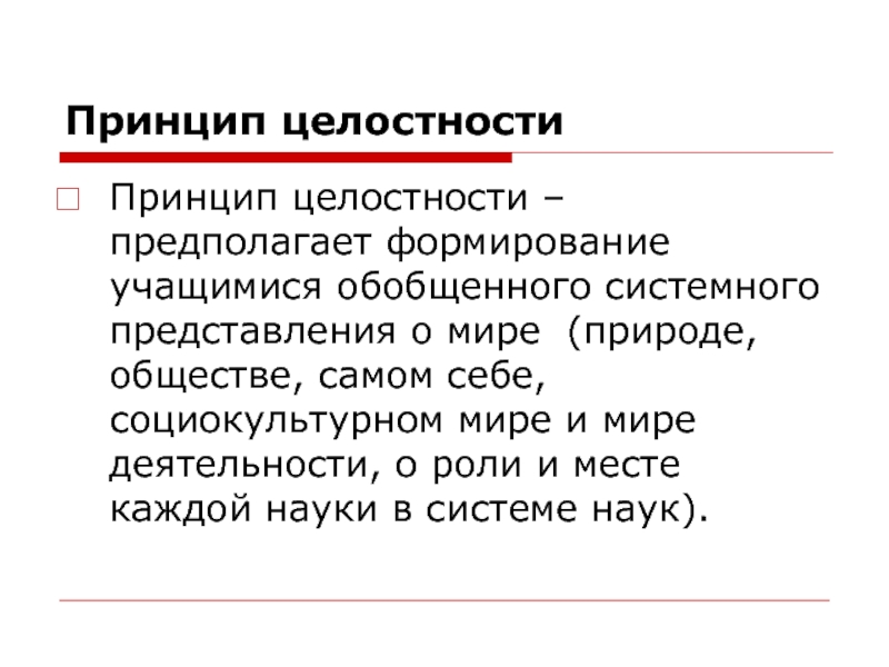 Принцип целостности – предполагает формирование учащимися обобщенного системного представления о