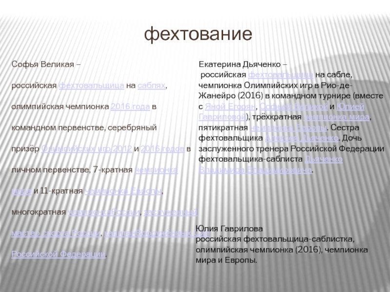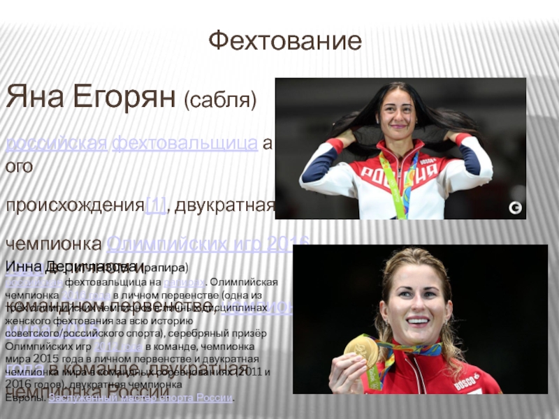 российская фехтовальщица-саблистка, олимпийская чемпионка (2016), чемпионка мира и Европы.