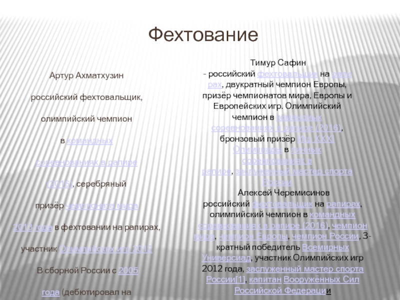 Тимур Сафин - российский фехтовальщик на рапирах, двукратный чемпион Европы, призёр чемпионатов мира, Европы и Европейских игр. Олимпийский чемпион в командных соревнованиях в рапире (2016), бронзовый призёр Игр XXXI Олимпиады в личных соревнованиях в рапире, заслуженный мастер спорта России