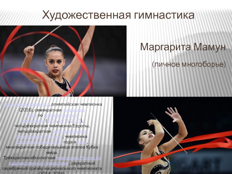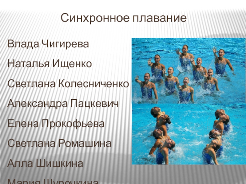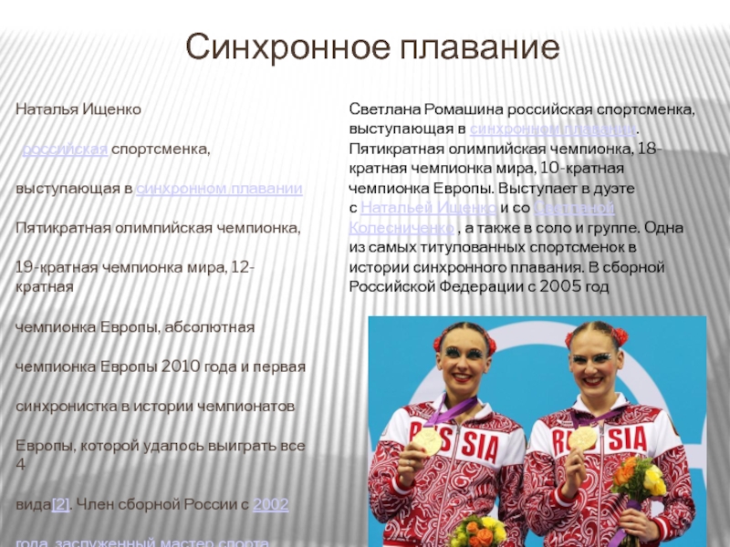 Светлана Ромашина российская спортсменка, выступающая в синхронном плавании. Пятикратная олимпийская чемпионка, 18-кратная чемпионка мира, 10-кратная чемпионка Европы. Выступает в дуэте с Натальей Ищенко и со Светланой Колесниченко , а также в соло и группе. Одна из самых титулованных спортсменок в истории синхронного плавания. В сборной Российской Федерации с 2005 год
