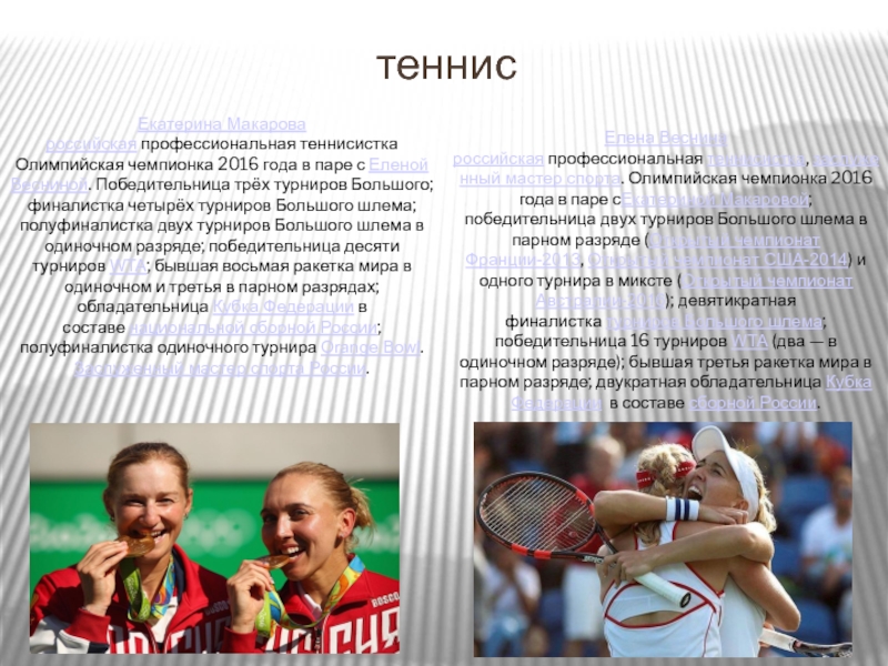 Елена Веснина российская профессиональная теннисистка, заслуженный мастер спорта. Олимпийская чемпионка 2016 года в паре сЕкатериной Макаровой; победительница двух турниров Большого шлема в парном разряде (Открытый чемпионат Франции-2013, Открытый чемпионат США-2014) и одного турнира в миксте (Открытый чемпионат Австралии-2016); девятикратная финалистка турниров Большого шлема; победительница 16 турниров WTA (два — в одиночном разряде); бывшая третья ракетка мира в парном разряде; двукратная обладательница Кубка Федерации в составе сборной России.