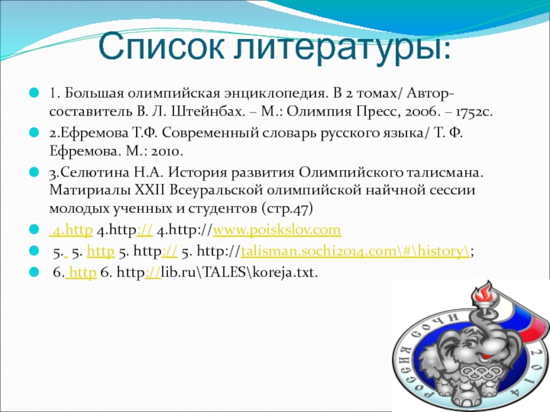 3.Селютина Н.А. История развития Олимпийского талисмана. Матириалы XXII Всеуральской олимпийской найчной сессии молодых ученных и студентов (стр.47)