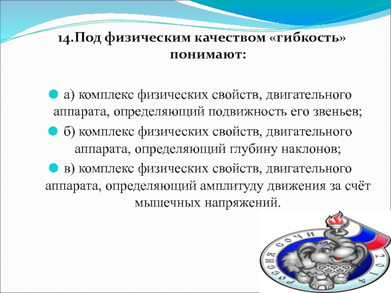 в) комплекс физических свойств, двигательного аппарата, определяющий амплитуду движения за счёт мышечных напряжений.