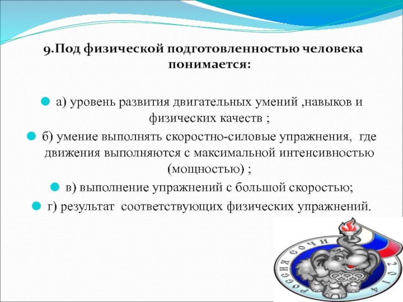 г) уровень обусловленный наследственности и регулярностью и занятий физической культурой и спортом.