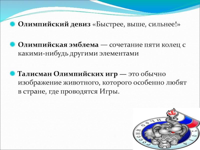 Слайд 5Олимпийский девиз «Быстрее, выше, сильнее!»