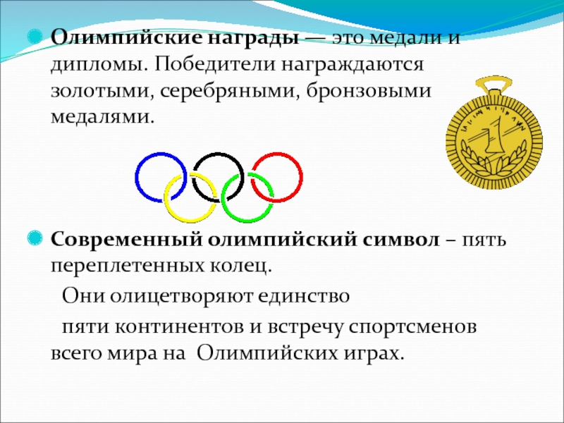 Слайд 4Олимпийские награды — это медали и дипломы. Победители награждаются золотыми, серебряными,