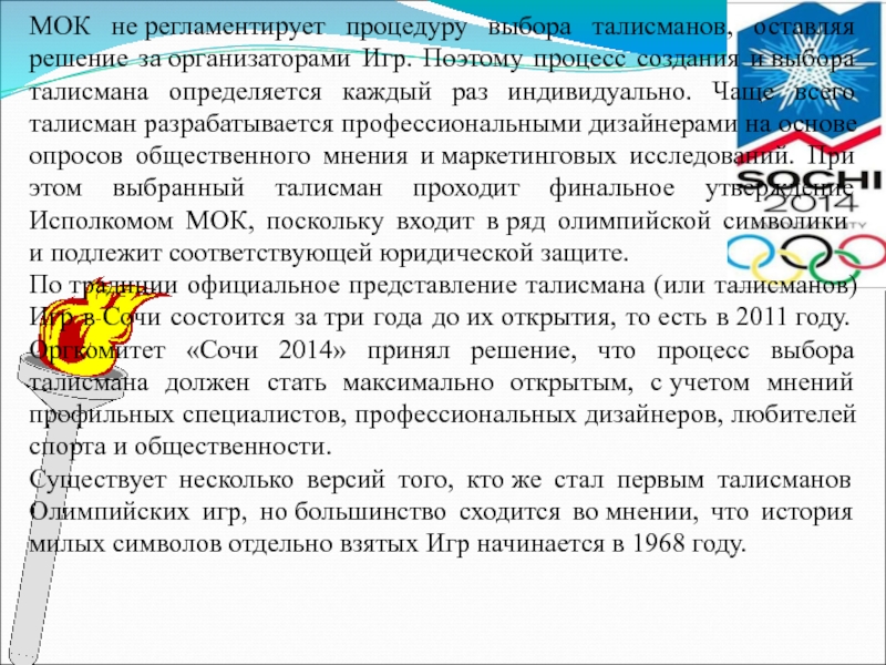 Слайд 7МОК не регламентирует процедуру выбора талисманов, оставляя решение за организаторами Игр. Поэтому процесс