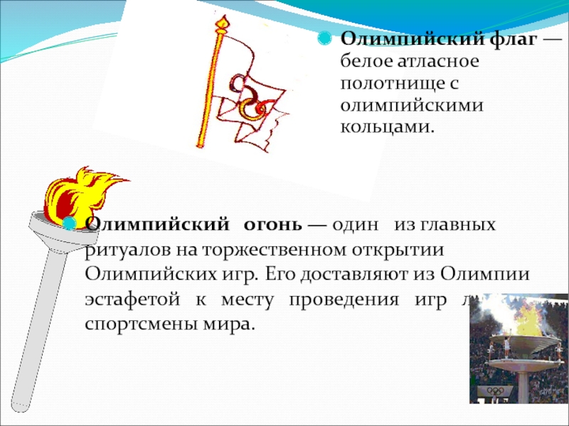 открытии Олимпийских игр. Его доставляют из Олимпии эстафетой к месту проведения игр лучшие спортсмены мира.