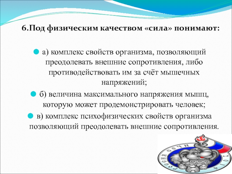 в) комплекс психофизических свойств организма позволяющий преодолевать внешние сопротивления.