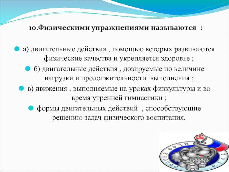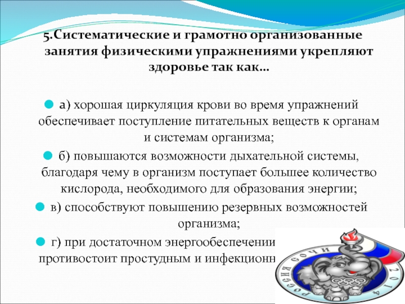 5.Систематические и грамотно организованные занятия физическими упражнениями укрепляют здоровье так как…
