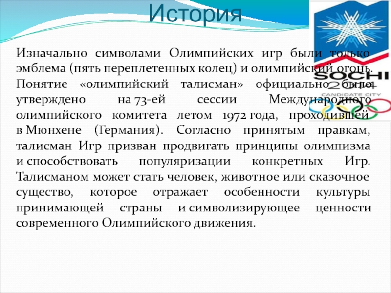 огонь. Понятие «олимпийский талисман» официально было утверждено на 73-ей сессии Международного олимпийского комитета летом 1972 года, проходившей в Мюнхене (Германия). Согласно принятым правкам, талисман Игр призван продвигать принципы олимпизма и способствовать популяризации конкретных Игр. Талисманом может стать человек, животное или сказочное существо, которое отражает особенности культуры принимающей страны и символизирующее ценности современного Олимпийского движения.