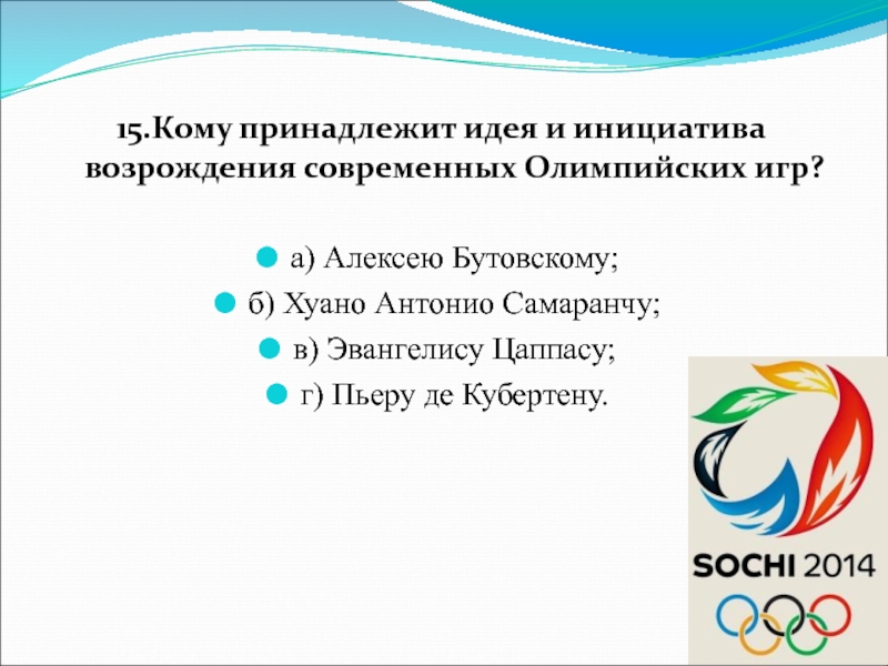15.Кому принадлежит идея и инициатива возрождения современных Олимпийских игр?