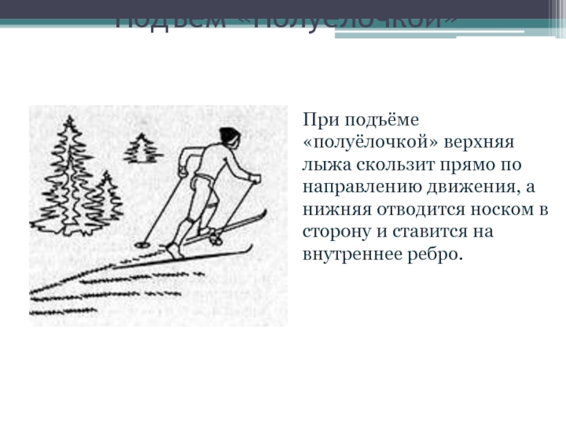 При подъёме «полуёлочкой» верхняя лыжа скользит прямо по направлению движения,