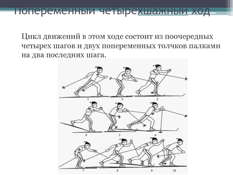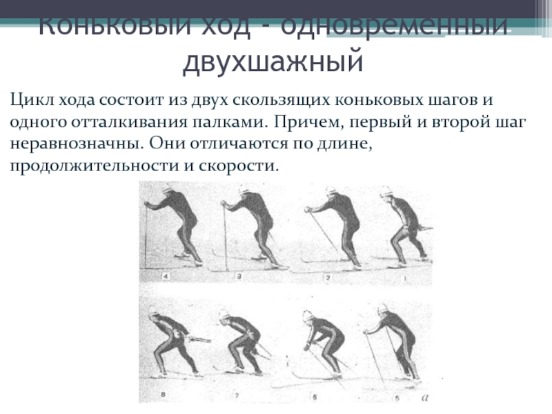 шагов и одного отталкивания палками. Причем, первый и второй шаг неравнозначны. Они отличаются по длине, продолжительности и скорости.
