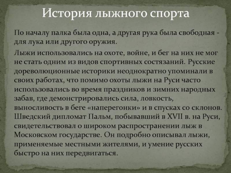 Лыжи использовались на охоте, войне, и бег на них не мог не стать одним из видов спортивных состязаний. Русские дореволюционные историки неоднократно упоминали в своих работах, что помимо охоты лыжи на Руси часто использовались во время праздников и зимних народных забав, где демонстрировались сила, ловкость, выносливость в беге «наперегонки» и в спусках со склонов. Шведский дипломат Пальм, побывавший в XVII в. на Руси, свидетельствовал о широком распространении лыж в Московском государстве. Он подробно описывал лыжи, применяемые местными жителями, и умение русских быстро на них передвигаться.