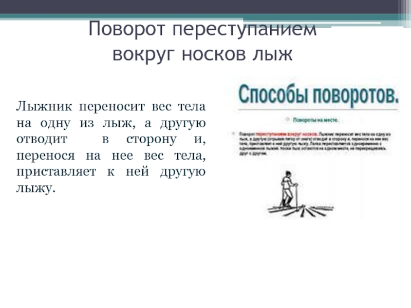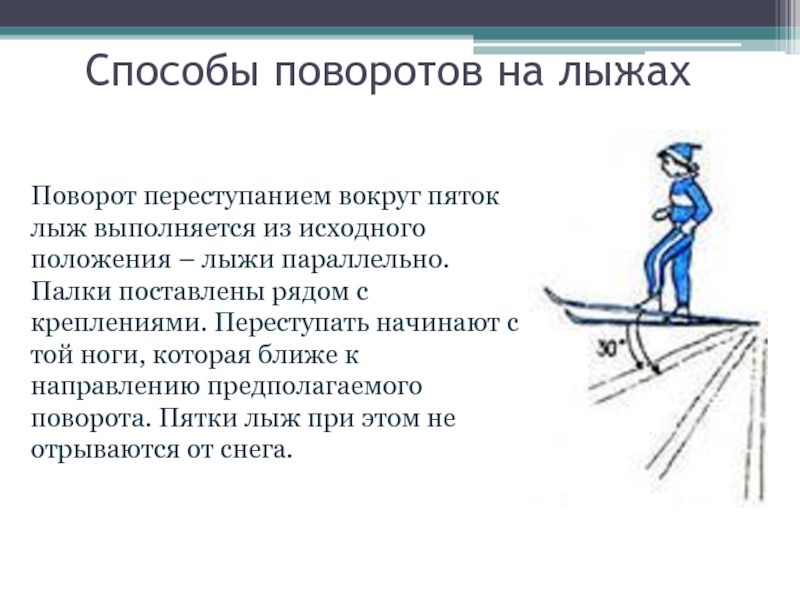 положения – лыжи параллельно. Палки поставлены рядом с креплениями. Переступать начинают с той ноги, которая ближе к направлению предполагаемого поворота. Пятки лыж при этом не отрываются от снега.