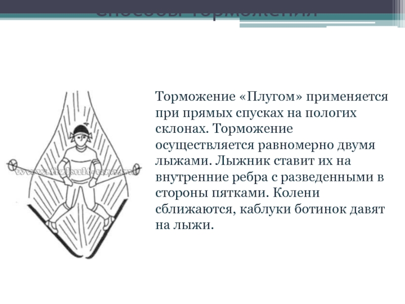 Торможение «Плугом» применяется при прямых спусках на пологих склонах. Торможение
