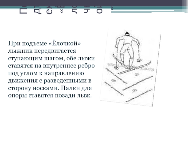 При подъеме «Ёлочкой» лыжник передвигается ступающим шагом, обе лыжи ставятся