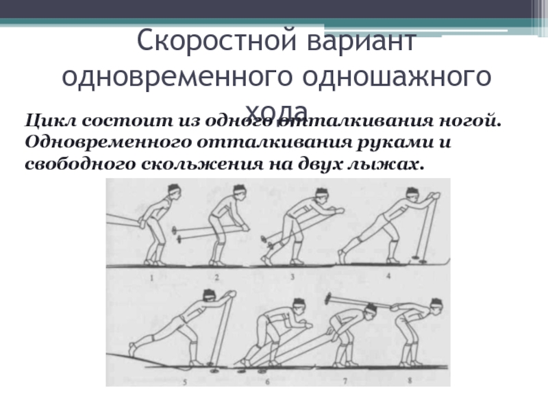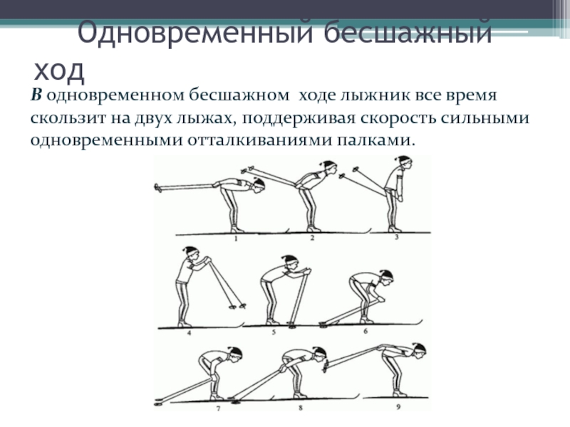 время скользит на двух лыжах, поддерживая скорость сильными одновременными отталкиваниями палками.