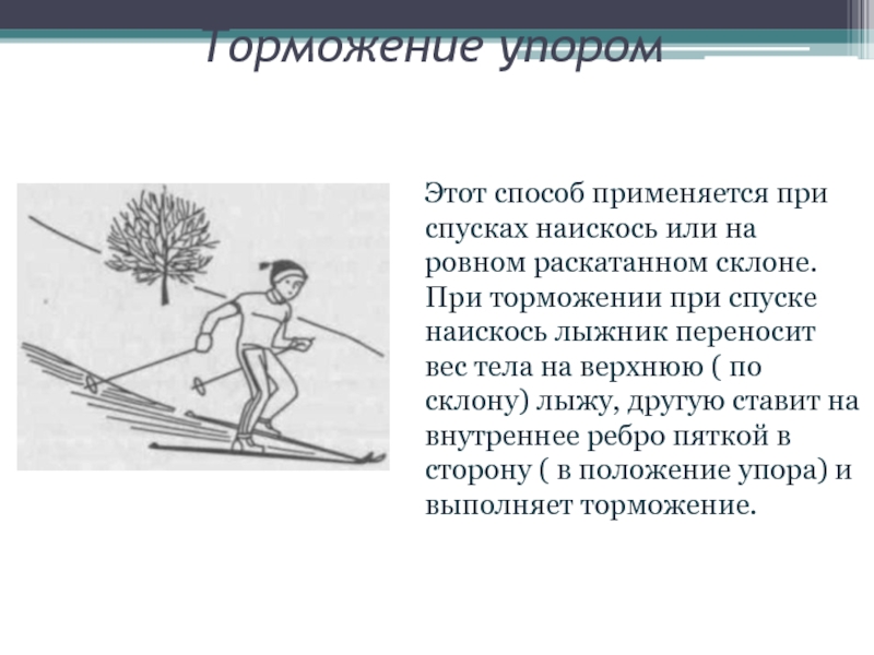 склоне. При торможении при спуске наискось лыжник переносит вес тела на верхнюю ( по склону) лыжу, другую ставит на внутреннее ребро пяткой в сторону ( в положение упора) и выполняет торможение.