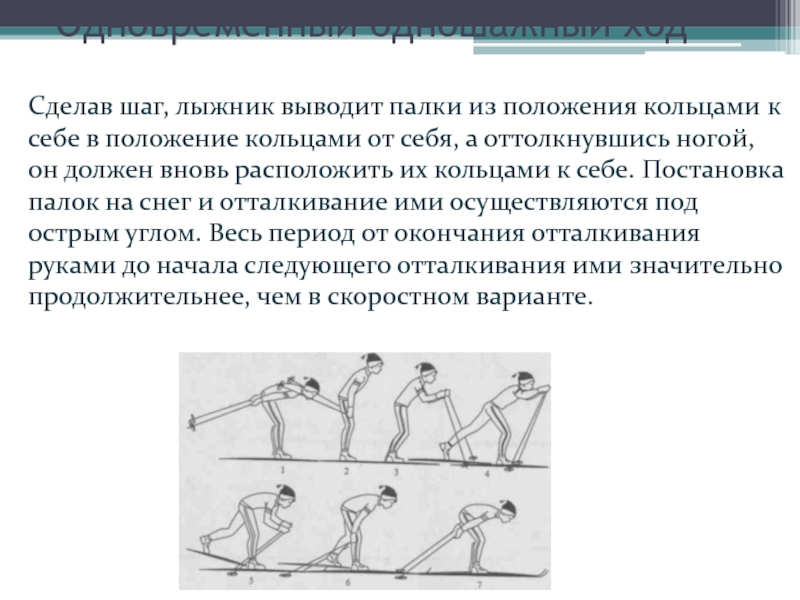себе в положение кольцами от себя, а оттолкнувшись ногой, он должен вновь расположить их кольцами к себе. Постановка палок на снег и отталкивание ими осуществляются под острым углом. Весь период от окончания отталкивания руками до начала следующего отталкивания ими значительно продолжительнее, чем в скоростном варианте.
