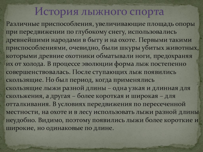 снегу, использовались древнейшими народами в быту и на охоте. Первыми такими приспособлениями, очевидно, были шкуры убитых животных, которыми древние охотники обматывали ноги, предохраняя их от холода. В процессе эволюции форма лыж постепенно совершенствовалась. После ступающих лыж появились скользящие. Но был период, когда применялись скользящие лыжи разной длины – одна узкая и длинная для скольжения, а другая – более короткая и широкая – для отталкивания. В условиях передвижения по пересеченной местности, на охоте и в лесу использовать лыжи разной длины неудобно. Видимо, поэтому появились лыжи более короткие и широкие, но одинаковые по длине.