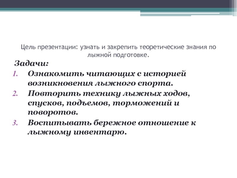 Цель презентации: узнать и закрепить теоретические знания по лыжной подготовке.