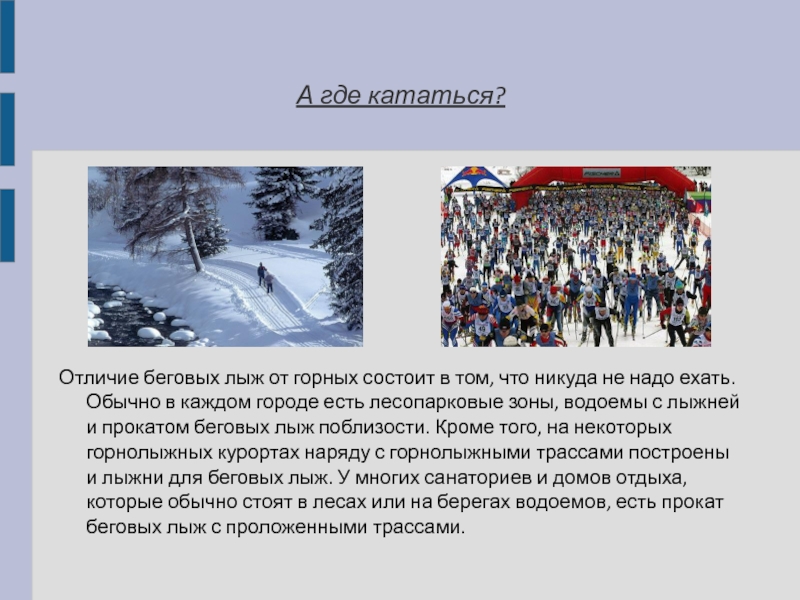 что никуда не надо ехать. Обычно в каждом городе есть лесопарковые зоны, водоемы с лыжней и прокатом беговых лыж поблизости. Кроме того, на некоторых горнолыжных курортах наряду с горнолыжными трассами построены и лыжни для беговых лыж. У многих санаториев и домов отдыха, которые обычно стоят в лесах или на берегах водоемов, есть прокат беговых лыж с проложенными трассами.