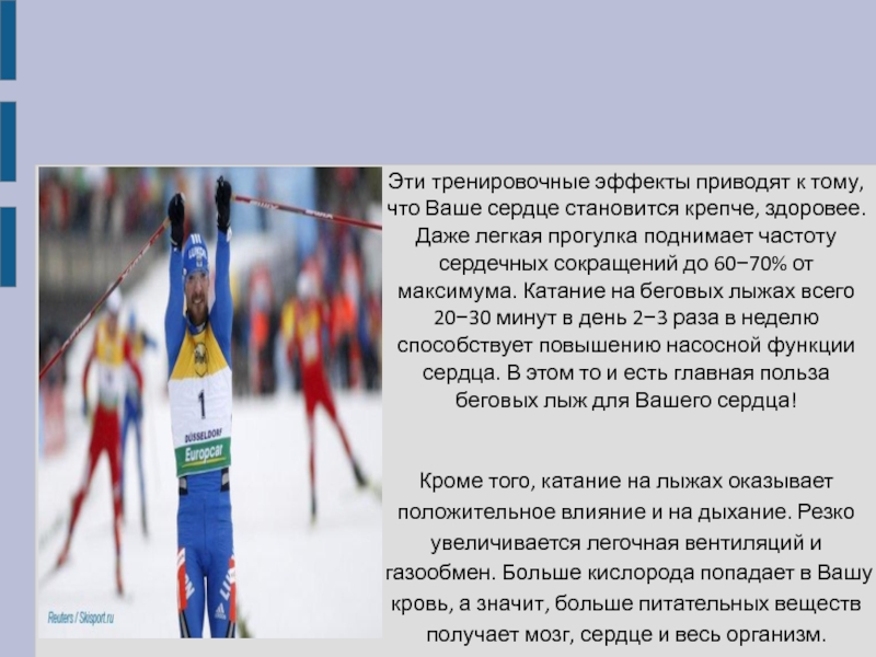 здоровее. Даже легкая прогулка поднимает частоту сердечных сокращений до 60−70% от максимума. Катание на беговых лыжах всего 20−30 минут в день 2−3 раза в неделю способствует повышению насосной функции сердца. В этом то и есть главная польза беговых лыж для Вашего сердца!