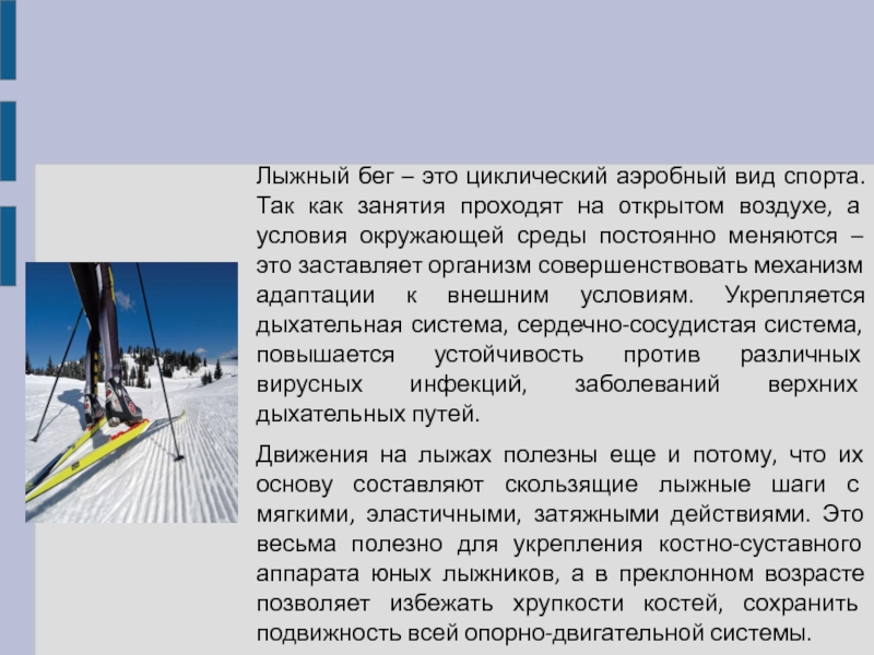 Слайд 12Лыжный бег – это циклический аэробный вид спорта. Так как занятия