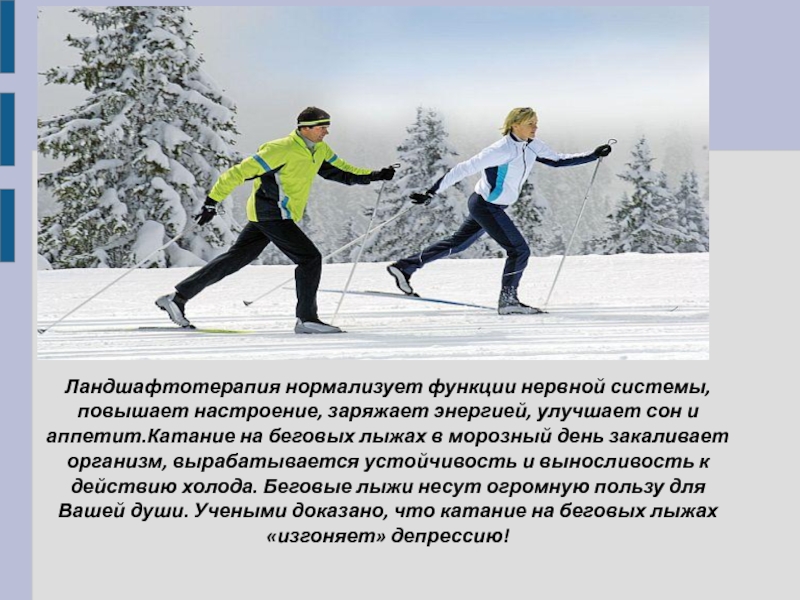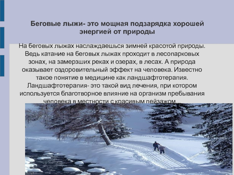 наслаждаешься зимней красотой природы. Ведь катание на беговых лыжах проходит в лесопарковых зонах, на замерзших реках и озерах, в лесах. А природа оказывает оздоровительный эффект на человека. Известно такое понятие в медицине как ландшафтотерапия. Ландшафтотерапия- это такой вид лечения, при котором используется благотворное влияние на организм пребывания человека в местности с красивым пейзажом...