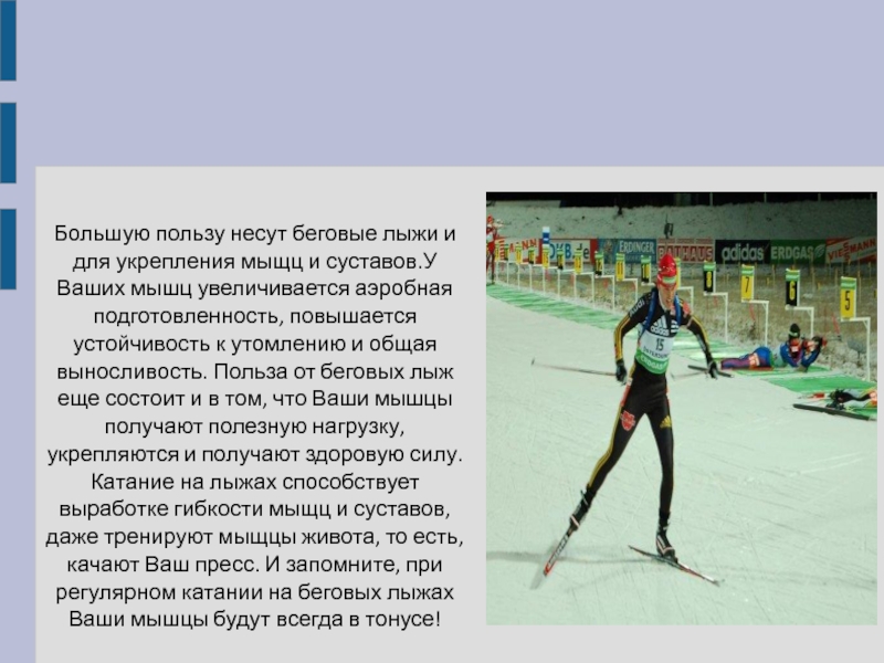 Слайд 9Большую пользу несут беговые лыжи и для укрепления мыщц и суставов.У